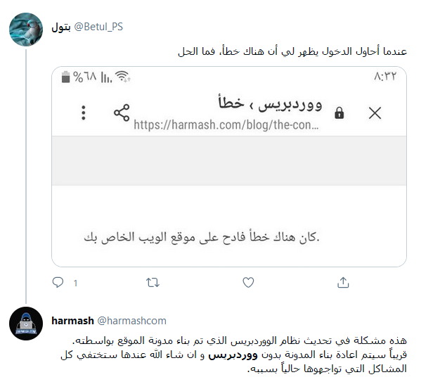 المهم، من بعد التحديث تعطّلت المدونة بالكامل و أصبح أي زائر يدخل إليها يظهر له رسالة تقول “كان هناك خطأ فادح في موقع الويب الخاص بك” و هذه الرسالة من إحدى متابعاتنا في توتير تعلمنا بذلك.