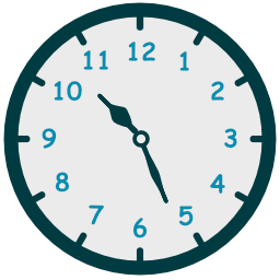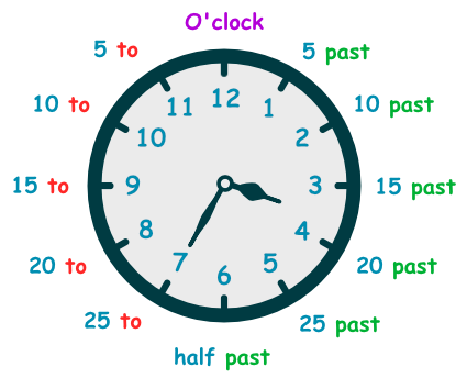 - حين يكون عقرب الدقائق جهة يمين الساعة إستخدم الكلمة past للإشارة إلى عدد الدقائق التي تسبق الساعة الحالية.